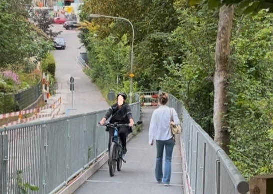 Die Stadt Zürich hat in den Sommerferien ein öffentliches Velofahrverbot für die Fussgängerbrücke am Stöckentobelbach durchgesetzt. Der Fussweg ist gut sichtbar mit einem Fahrverbot für Velo- und Bikefahrende sowie dem Hinweissschild «Velo schieben» ausgeschildert. Nach einem Monat Sommerferien betrete ich die Fussgängerbrücke wieder einmal mit meinem Hund. Prompt kommt mir ein Velofahrer entgegen und das an einer unübersichtlichen Stelle.